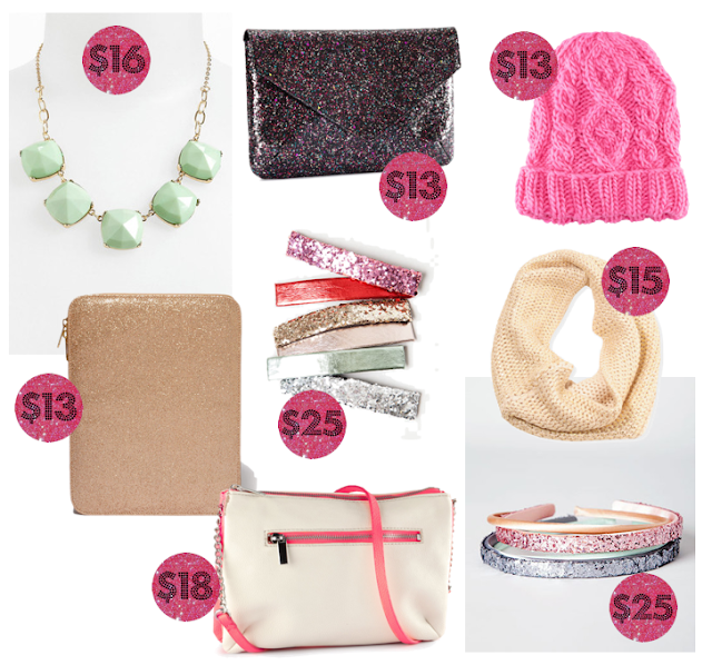 Stephan & Co. Facet Statement Necklace ~ Nordstrom // Glitter Envelop Clutch ~ H&M // Neon Beanie ~ H&M // Glittered Tablet Computer Case ~ Forever 21 // Sparkle and Shine Bobbi Set ~ ban.do // Metallic Flake Infinity Scarf ~ Forever 21 // Neon Accent Chain Purse ~ H&M // Happy Duo Headband Set ~ ban.do