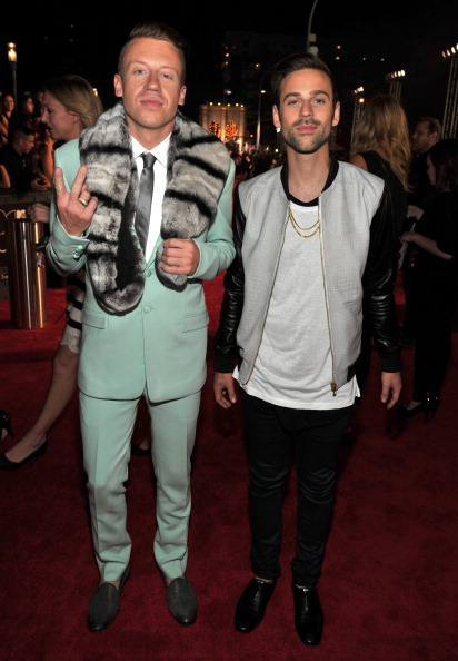 I would totally date either one of them. I love when guys are so confident in their manliness that they aren’t afraid to dress fashionably. I love this mint green suit that Macklemore is wearing, as well as Ryan Lewis in the leather sleeved bomber jacket.